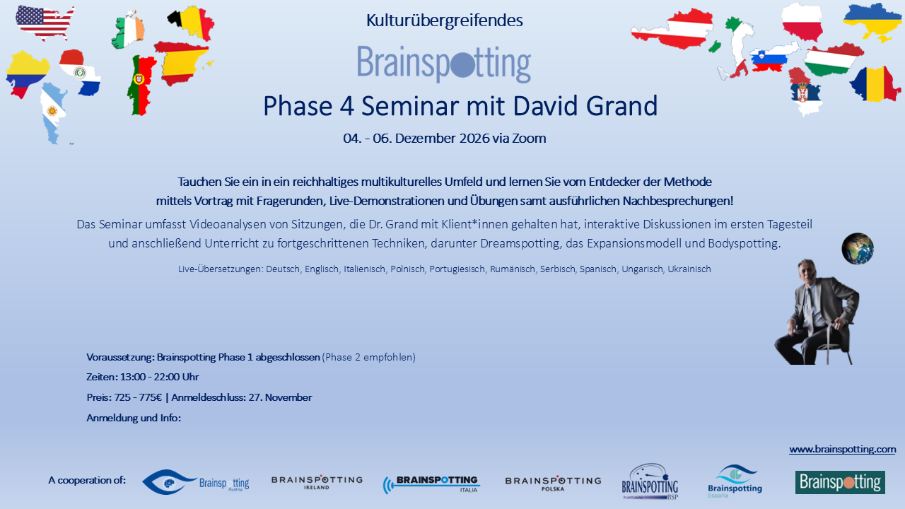 Im Anschluss daran wird Dr. Grand verschiedene fortgeschrittene Brainspotting-Techniken vorstellen, darunter Dreamspotting, das Expansionsmodell und Bodyspotting.