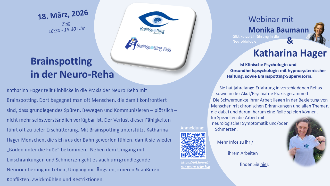 In diesem Webinar demonstrieren die Referentinnen Hintergründe zur Neurobiologie und geben Einblicke in die Praxis der Neuro-Reha mit Brainspotting.